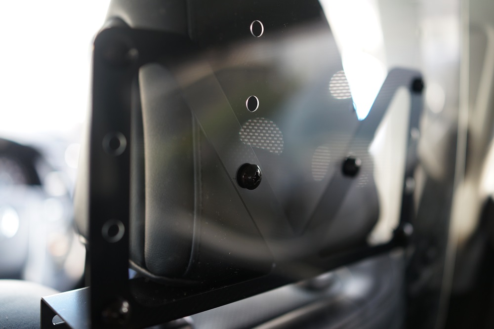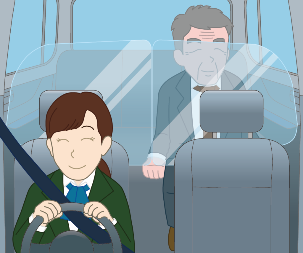 座席は想定以上に可動があります。運転手さんの体の大きさや、後部座席に座る方の位置や状態によって、私たちは座席を微妙に動かしています。 アクリル板をセパレートタイプにすることによって、装着したままリクライニングすることもできますし、運転席と助手席の位置をあえてずらして、アクリル板の面を広くとることも可能です。